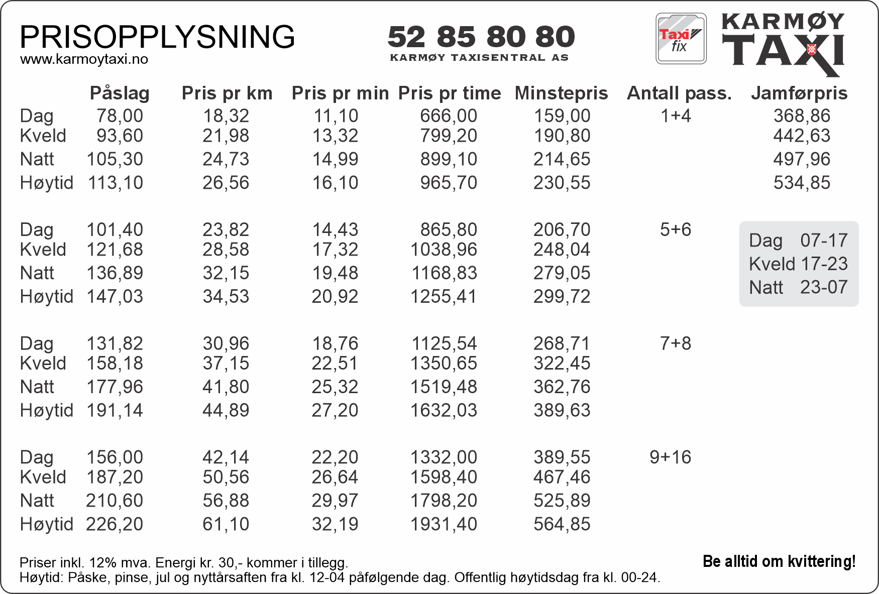 Prisene må forstås veiledende, og vi tar forbehold om at prisen kan avvike fra estimatet på reelle turer.* Høytid: Påske, pinse, jul og nyttårsaften fra kl. 12-04 påfølgende dag. Off. høytidsdag fra 00-24.